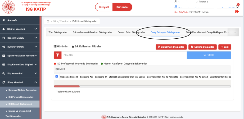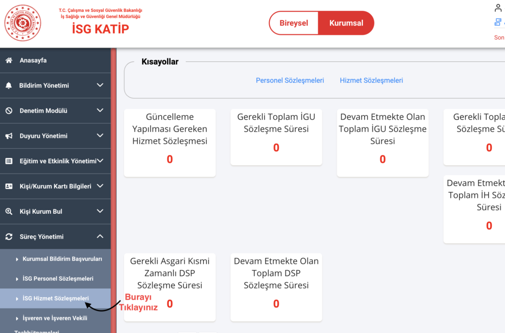 İSG Hizmet Sözleşmeleri alanını tıklayacağız.